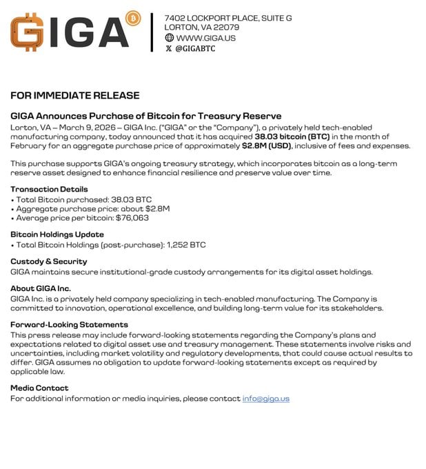 Privately held manufacturing agency GIGA has elevated its Bitcoin holdings to 1,252 BTC after buying 38 BTC final month, the corporate disclosed on Monday.