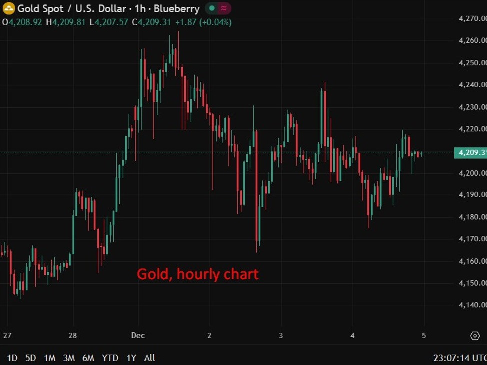 Gold is buying and selling just below US$4,210/oz on Friday morning Asia time, with merchants turning cautious forward of a cluster of delayed U.S. knowledge and the Federal Reserve’s assembly subsequent week, December 9 and 10. Spot costs slipped round 0.5% in a single day to roughly US$4,180, earlier than grinding again larger.