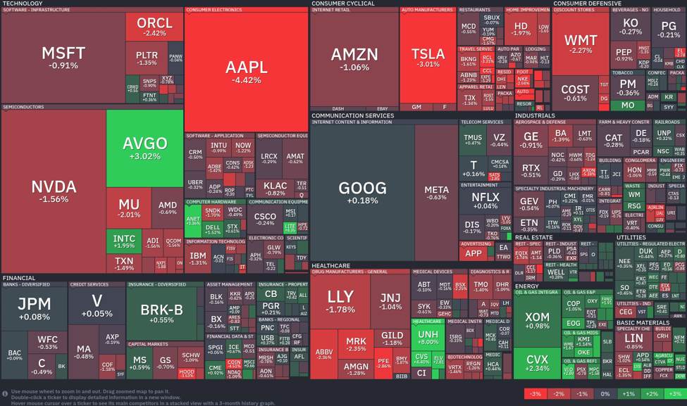 • Expertise: Tech shares are going through a downturn, pushed by declines in main gamers like Nvidia (NVDA) at -1.56% and Apple (AAPL) at -4.42%. This marks a difficult day for the semiconductor and shopper electronics sectors.
